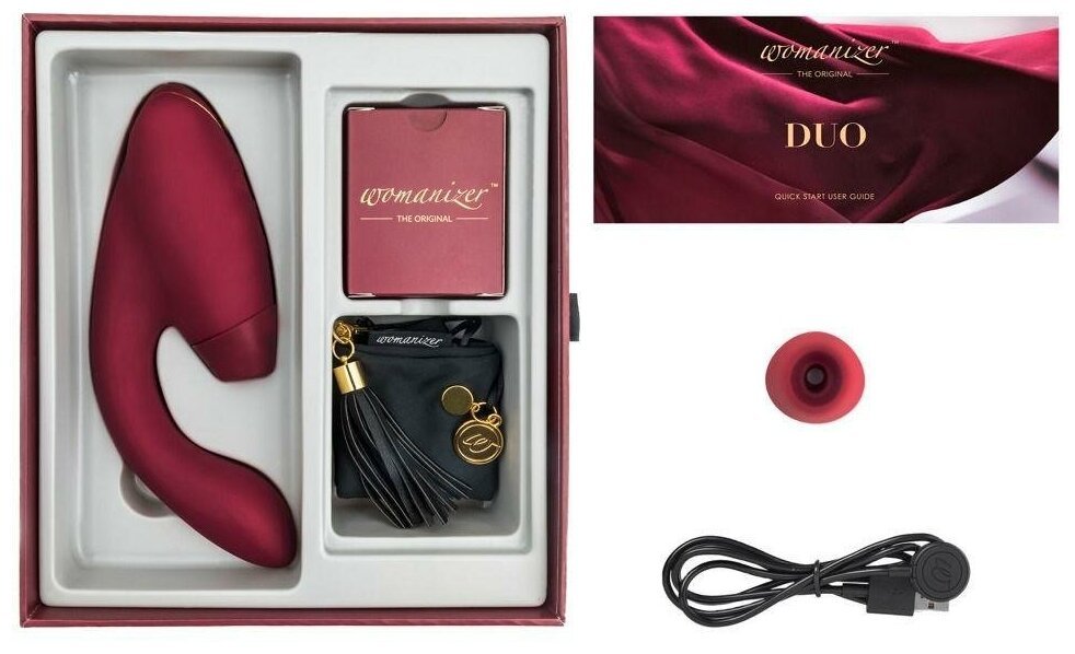 Womanizer DUO поставляется в стильной коробке. В комплект также входит зарядный USB-кабель, инструкция по применению и дополнительная силиконовая насадка малого объёма.