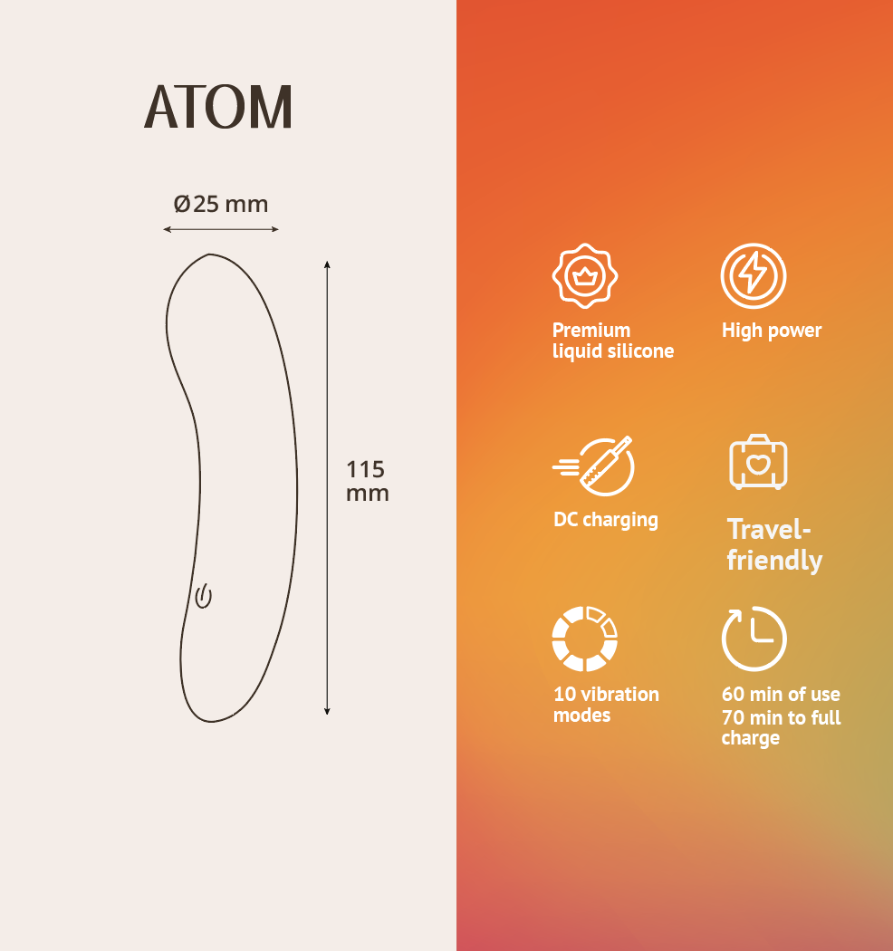 С глубокой вибрацией, сосредоточенной в рабочей части, Atom минимизирует вибрацию в ручке для большего комфорта при использовании. Удобное управление одной кнопкой позволяет легко переключаться между 10 вибрационными паттернами, предлагая разнообразные режимы для максимального наслаждения. Игрушка активируется зажатием кнопки на 3 секунды, сигнализируя о готовности короткой вибрацией.